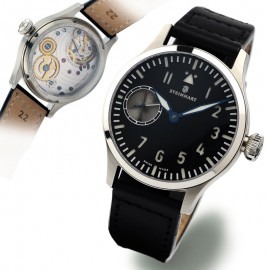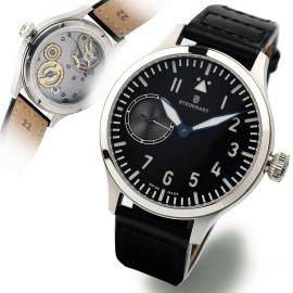 MOVEMENTST1 PremiumSwiss made handwinding 17 Jewels18.000 vibrations per hour 3/4-bridge with escape wheel island of our own production radial decentralized Geneva Stripespalled fork bridge pearledtwo-spoke screw balancebevelled swan-neck fineadjustment of our own production skeletonized and brushed ratchet wheelperlage und..